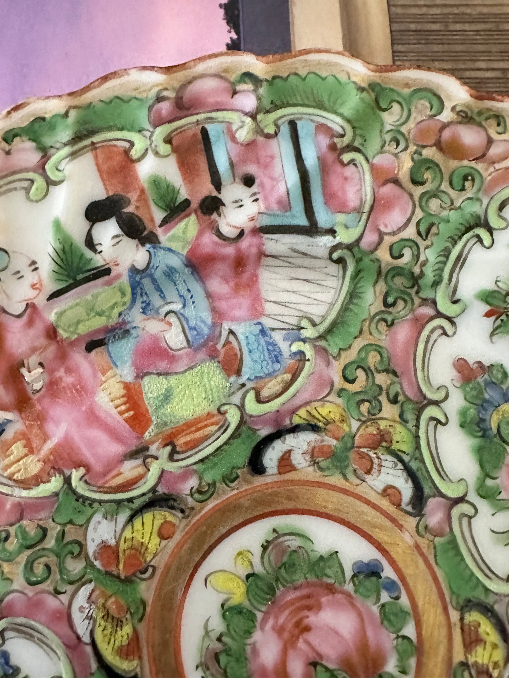 Antique Chinese Rose Medallion porcelain plate with scalloped rim and hand-painted figural and floral panels in vibrant pinks and greens. Raised enamel and gilt detailing throughout.
