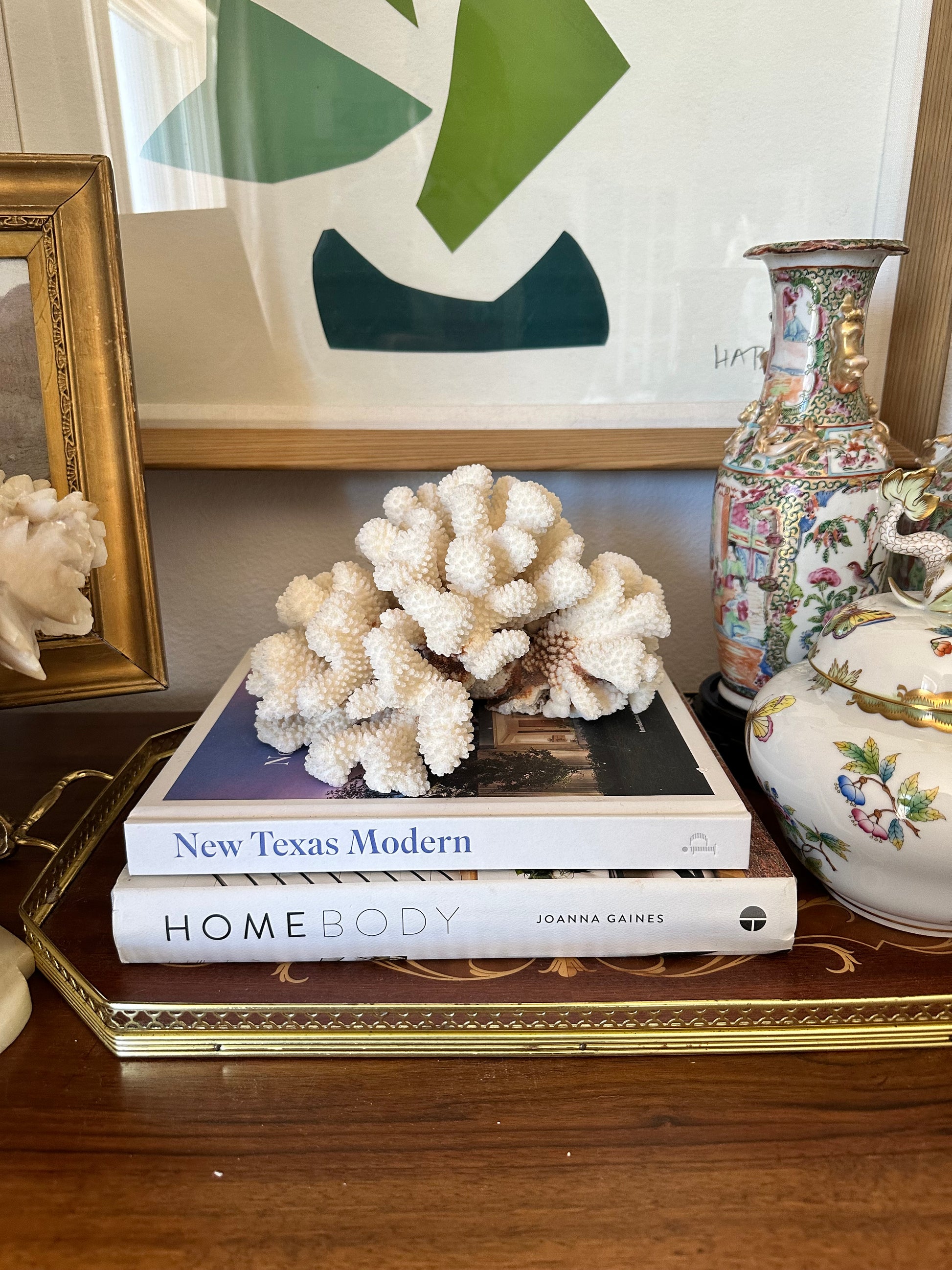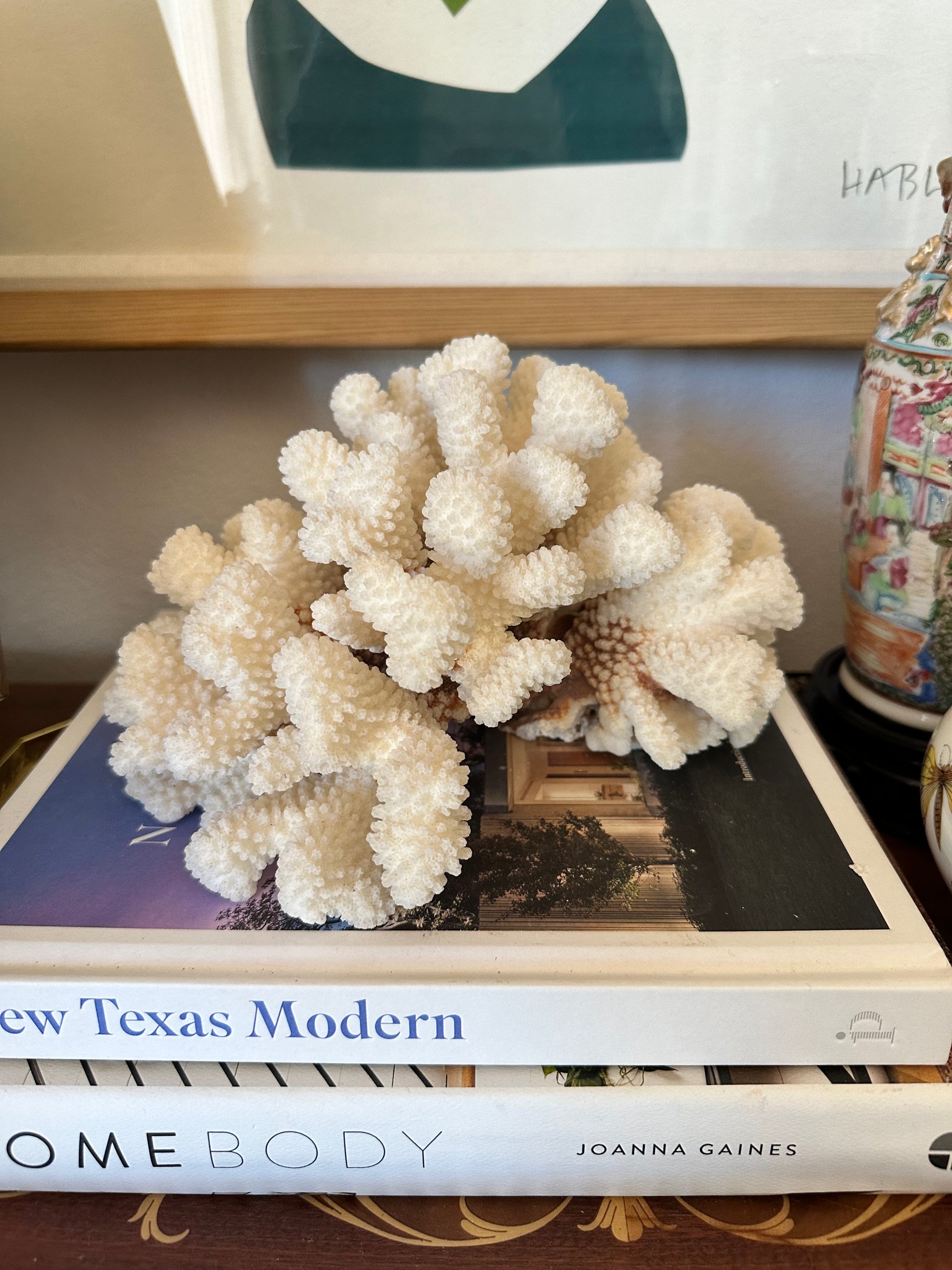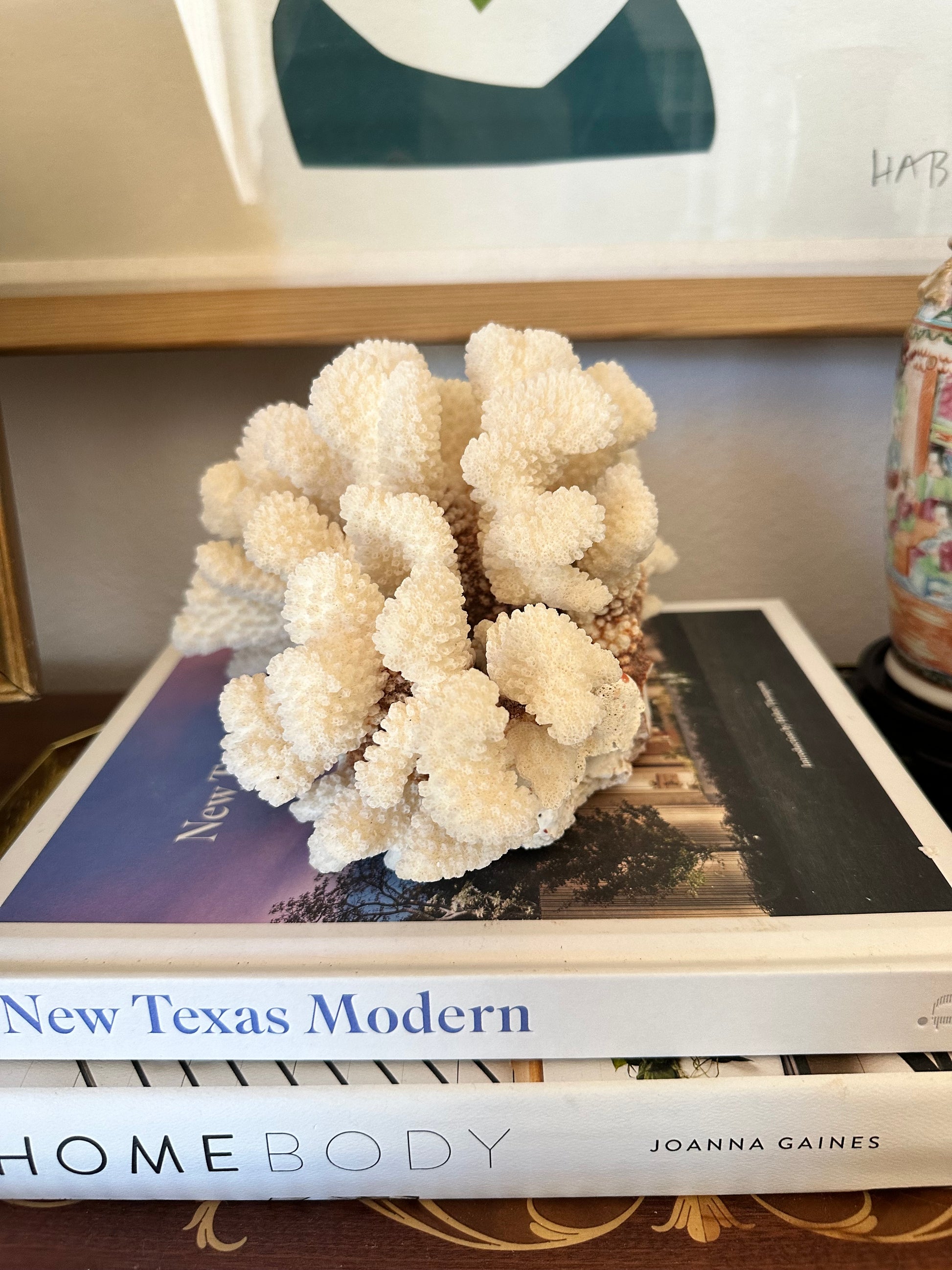 Beautiful natural cat paw coral specimen with full, sculptural branching and soft white tone. A striking styling piece for coffee tables, bookshelves, or layered atop art books. Adds organic texture to traditional, coastal, and collected interiors. Natural variations and blush tones on underside.